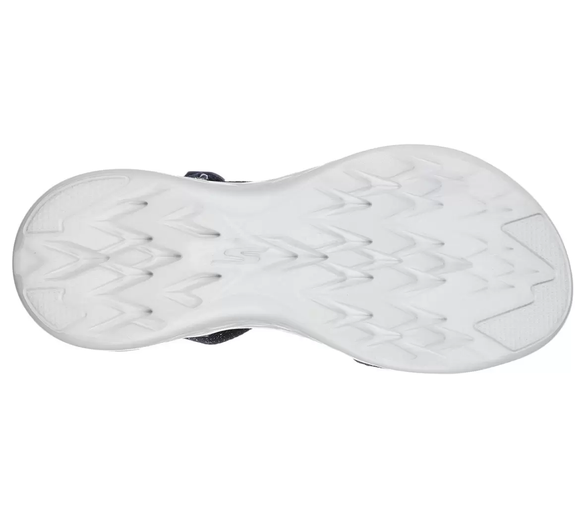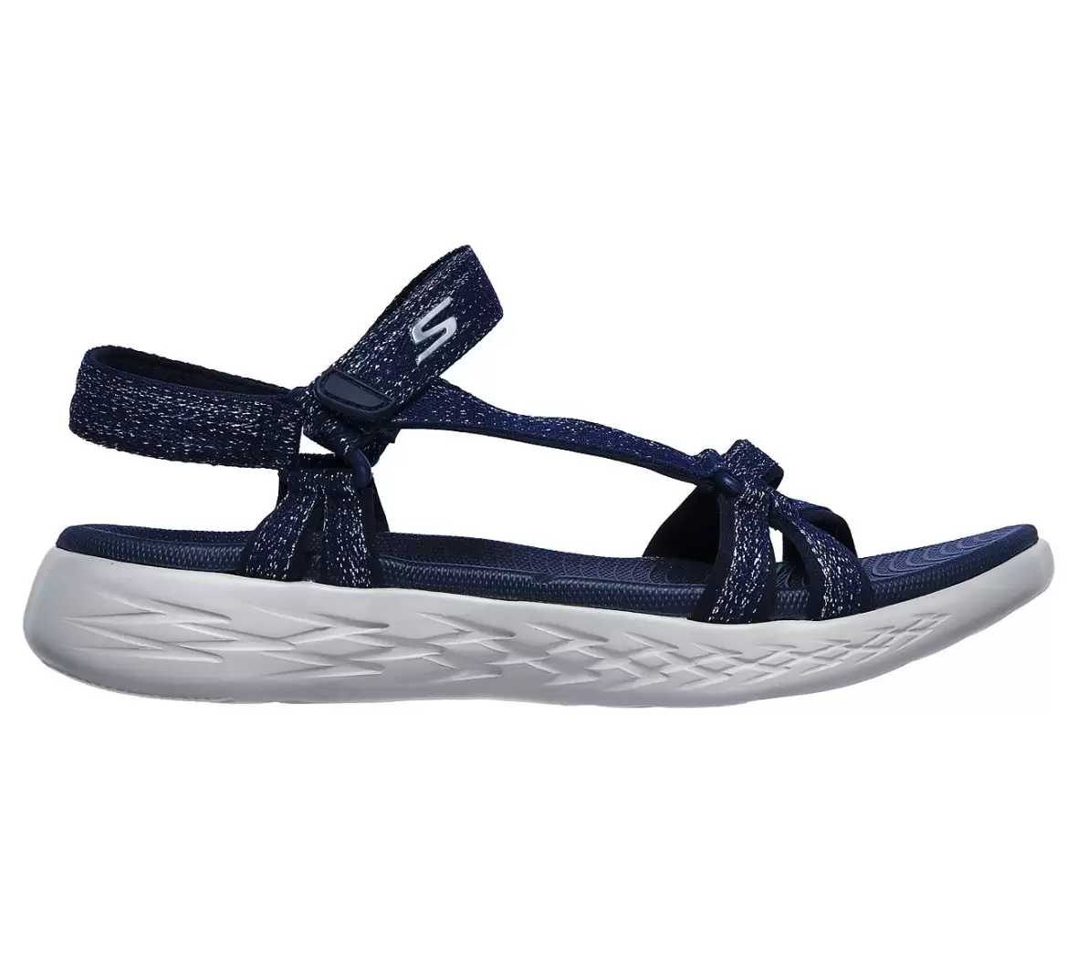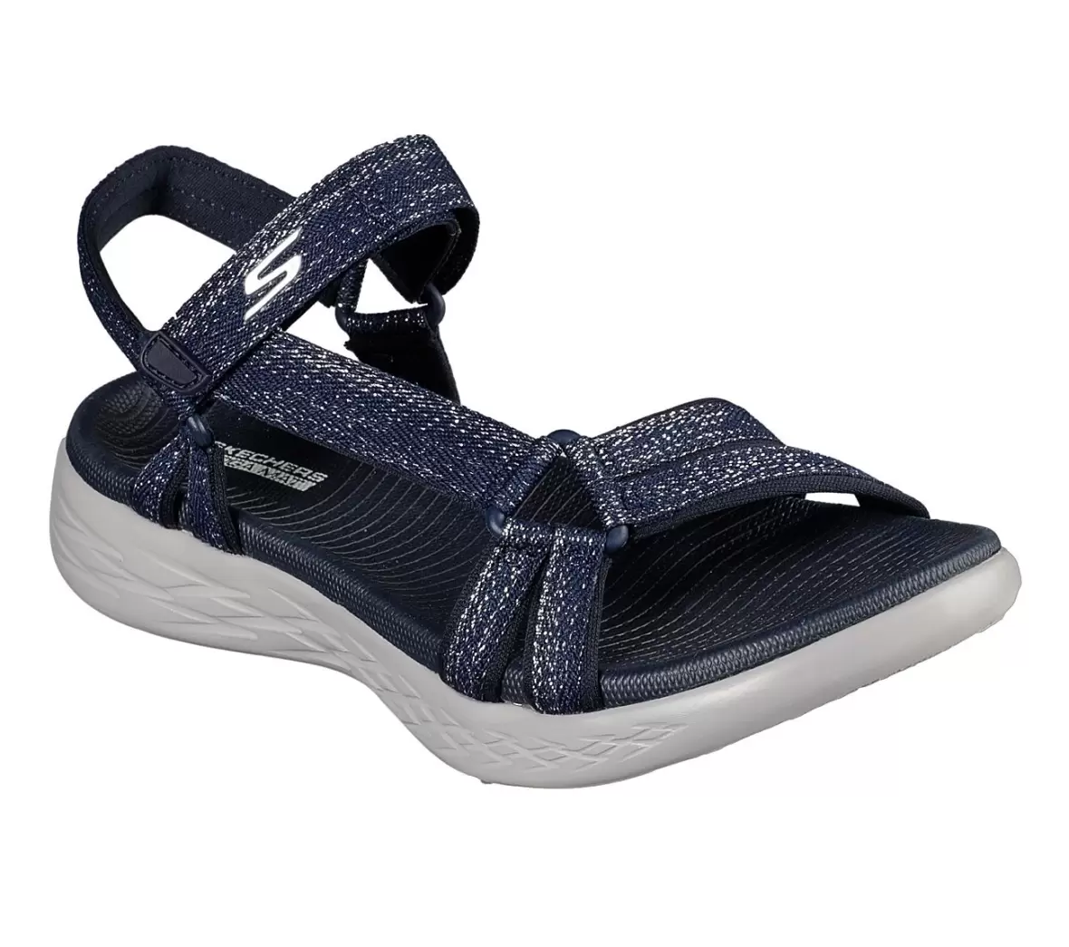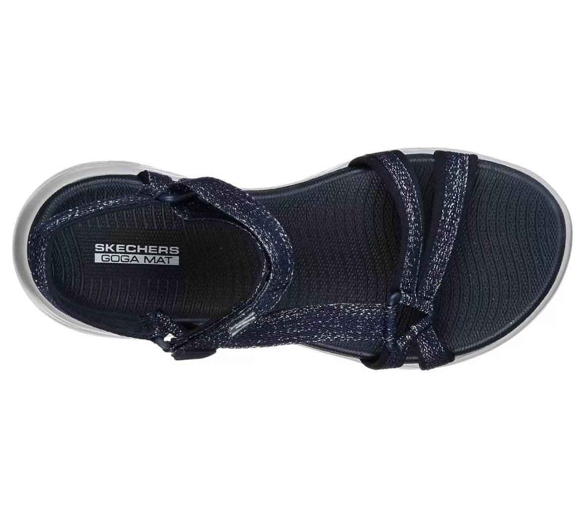 Art. nr. 16180 NVSLSkecheres On the go 600 sandal lavet i blå tekstil med et flot metallic glitrende finish, den har velcro lukning over vristen og en dejlig blød indersål i Goga mat der er utrolig blød og støddæmpende. Den lette og bløde ydersål i EVA giver en god fleksibilitet og er derfor velegnet til lange arbejdsdage eller almindelig fritidsbrug.