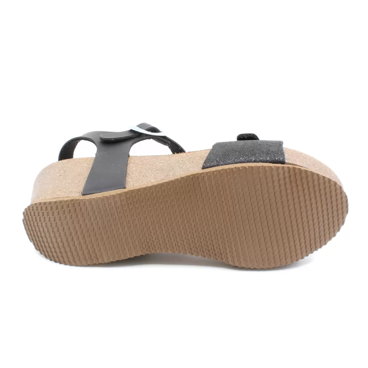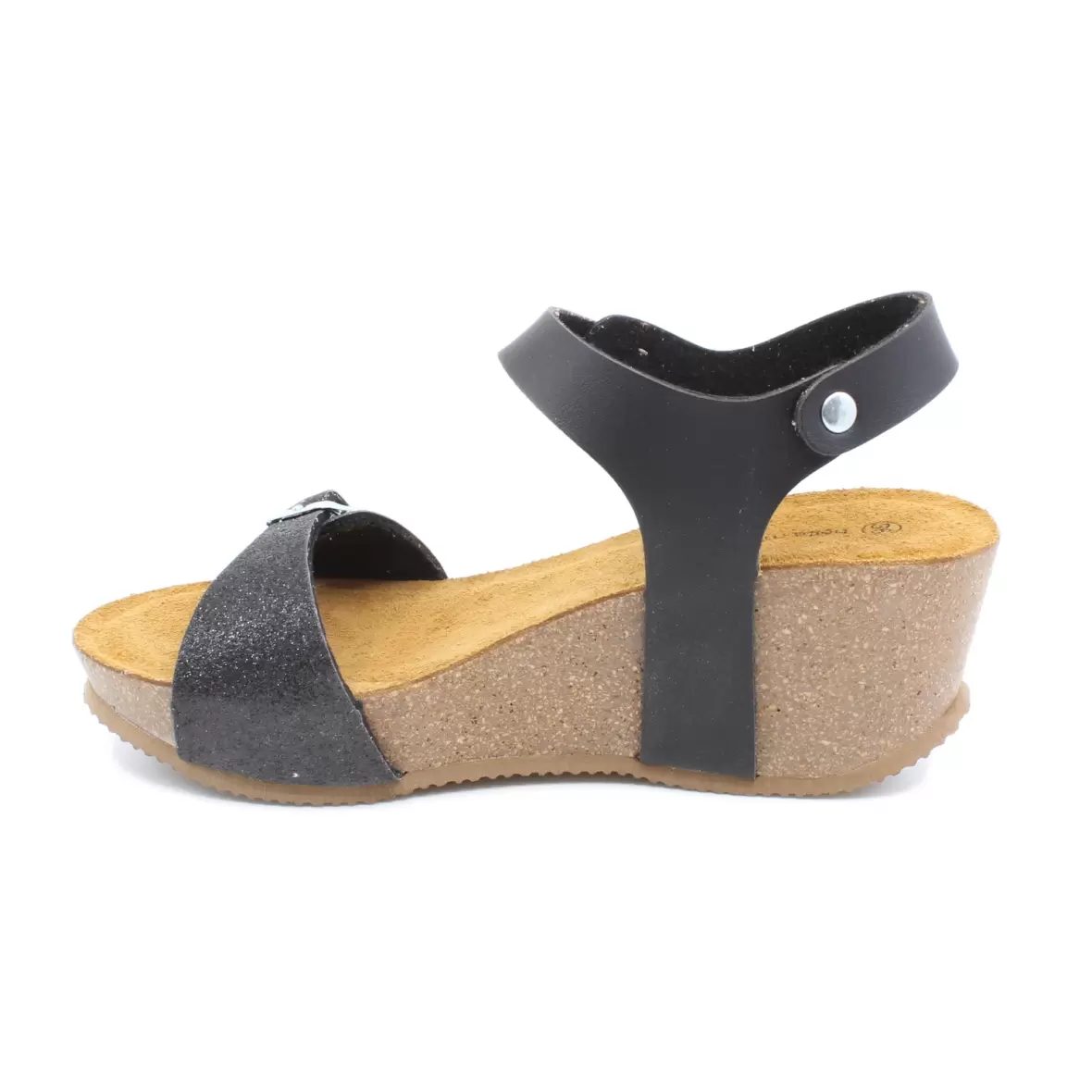 S21636-001Smart og behagelig sandal til kvinder fra Bella moda, med sort overdel, sandalen er udstyret med en forhøjet hæl, der er med til at give dem et rigtig fedt udtryk, på stropperne over foden, er der påsat smarte spænder, der passer perfekt til sandalens look, men også gør de nemt justers og tilpases din fod, sandalens sål, er lavet i et pænt kork look, som også giver en behagelig komfort.