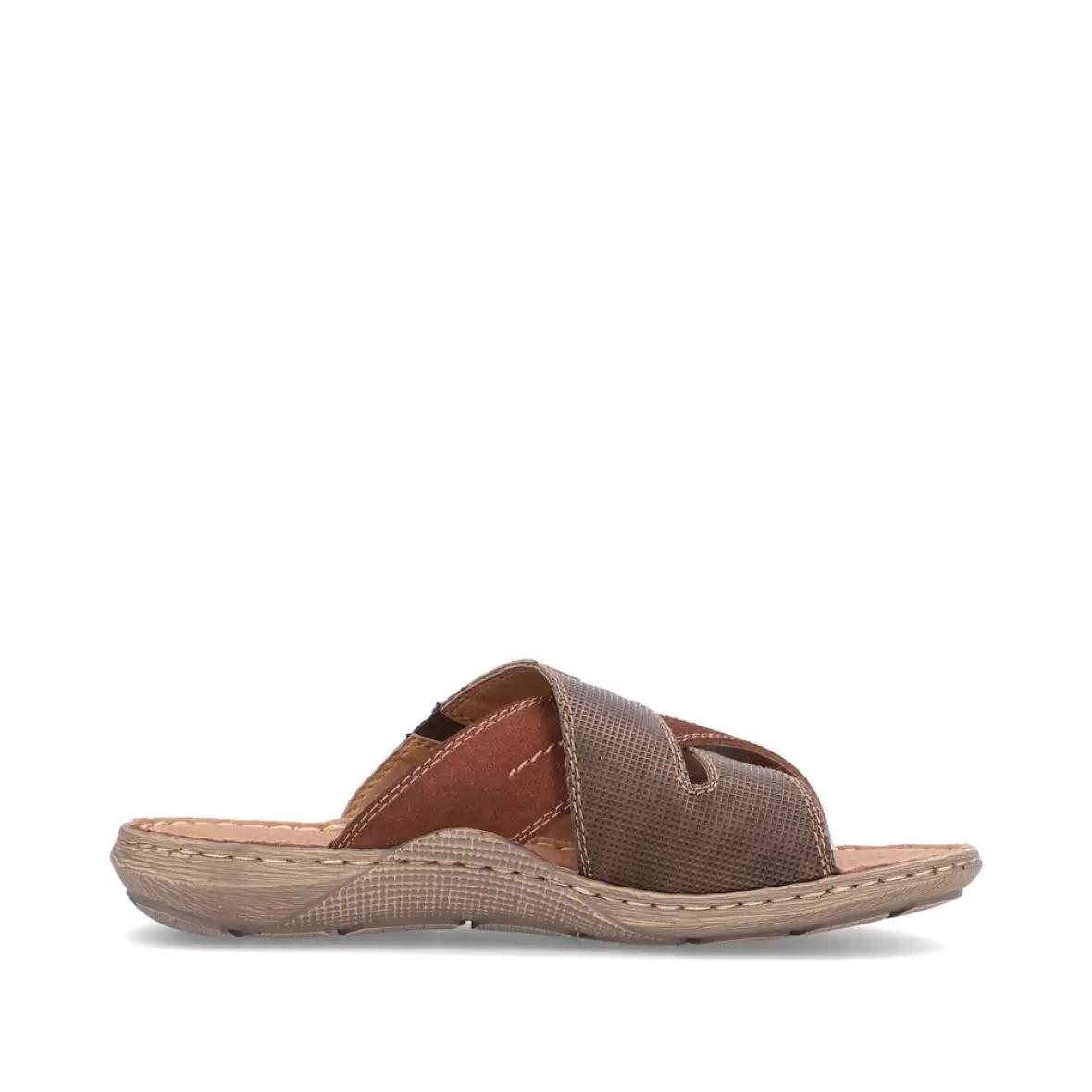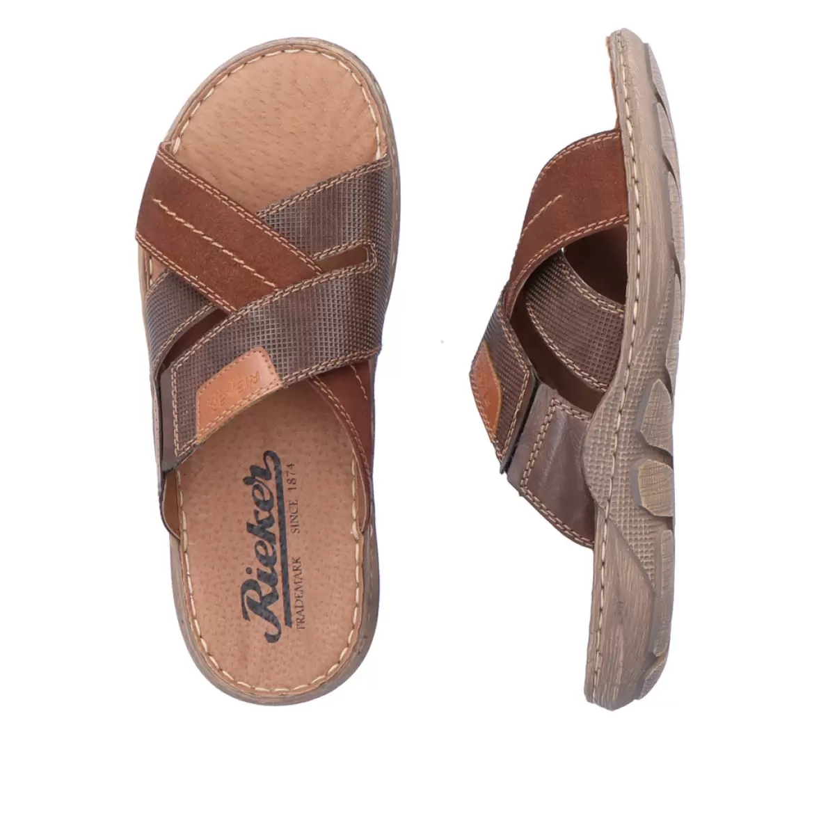 Art. No. 22053-25Dette er Rieker 22053-25, som er en slipper sandal til herrer fra Rieker. Designet er både praktisk og stilfuldt med en kombination af brunt læder og brunt mesh-materiale, der tillader fødderne at ånde. Disse sandaler er ideelle til sommerbrug og kan let tages på og af, hvilket gør dem til et godt valg for mænd på farten. Rieker er kendt for at skabe fodtøj, der tilbyder komfort, og disse sandaler ser ud til at have en blød indersål og en robust sål, der giver godt fodfæste. De syede detaljer bidrager til sandalens robuste udseende og kvalitetsfølelse.