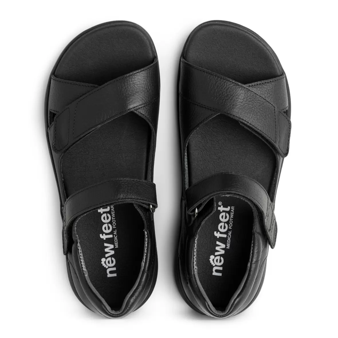 Art. No. 251-21-110New Feet 251-21-110 er en smart og praktisk damesandal, der kombinerer komfort, funktionalitet og et stilrent design. Modellen er fremstillet i glat kalveskind af høj kvalitet, som er både slidstærkt og let at vedligeholde, og indvendigt er sandalen konstrueret uden generende sømme for at skåne følsomme fødder – et oplagt valg til personer med diabetes eller andre fodproblemer.