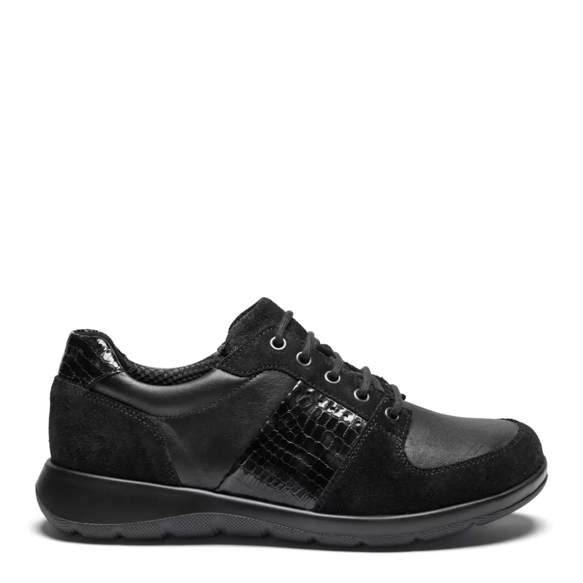 Skoen er fremstillet i en flot kombination af ruskind, glat læder og fleksibelt materiale med struktur, som både giver et elegant look og en behagelig pasform. Snørelukningen gør det muligt at tilpasse skoen præcist til foden, så du får optimal støtte i hverdagen.