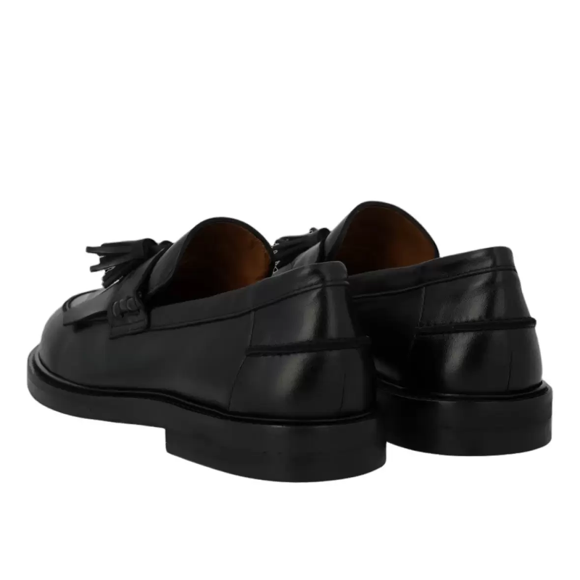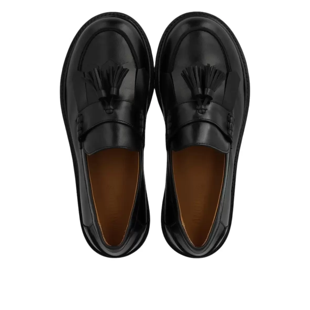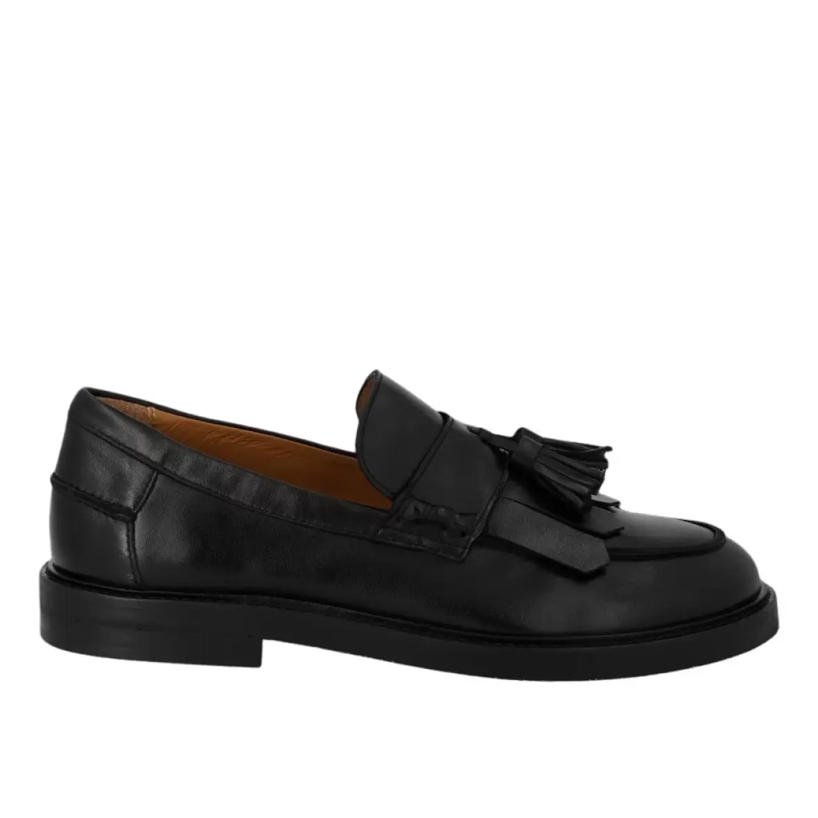 Art. No. 1721-101-1604Angulus LOAFER WITH TASSEL 1721-101-1604 er et par elegante loafers til damer, der kombinerer klassisk design med moderne komfort. Skoene er fremstillet i sort skind og har en tidløs silhuet, der fuldendes af dekorative kvaster på overdelen, som giver et sofistikeret og feminint touch. Den solide sål sikrer god komfort og holdbarhed, hvilket gør loafersene ideelle både til hverdagsbrug og mere formelle anledninger. Et alsidigt valg, der nemt kan styles med både bukser, nederdele og kjoler for et chic og stilfuldt look.