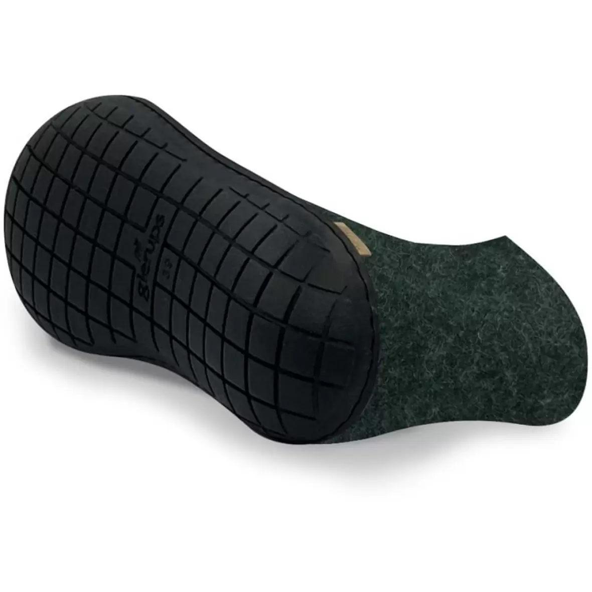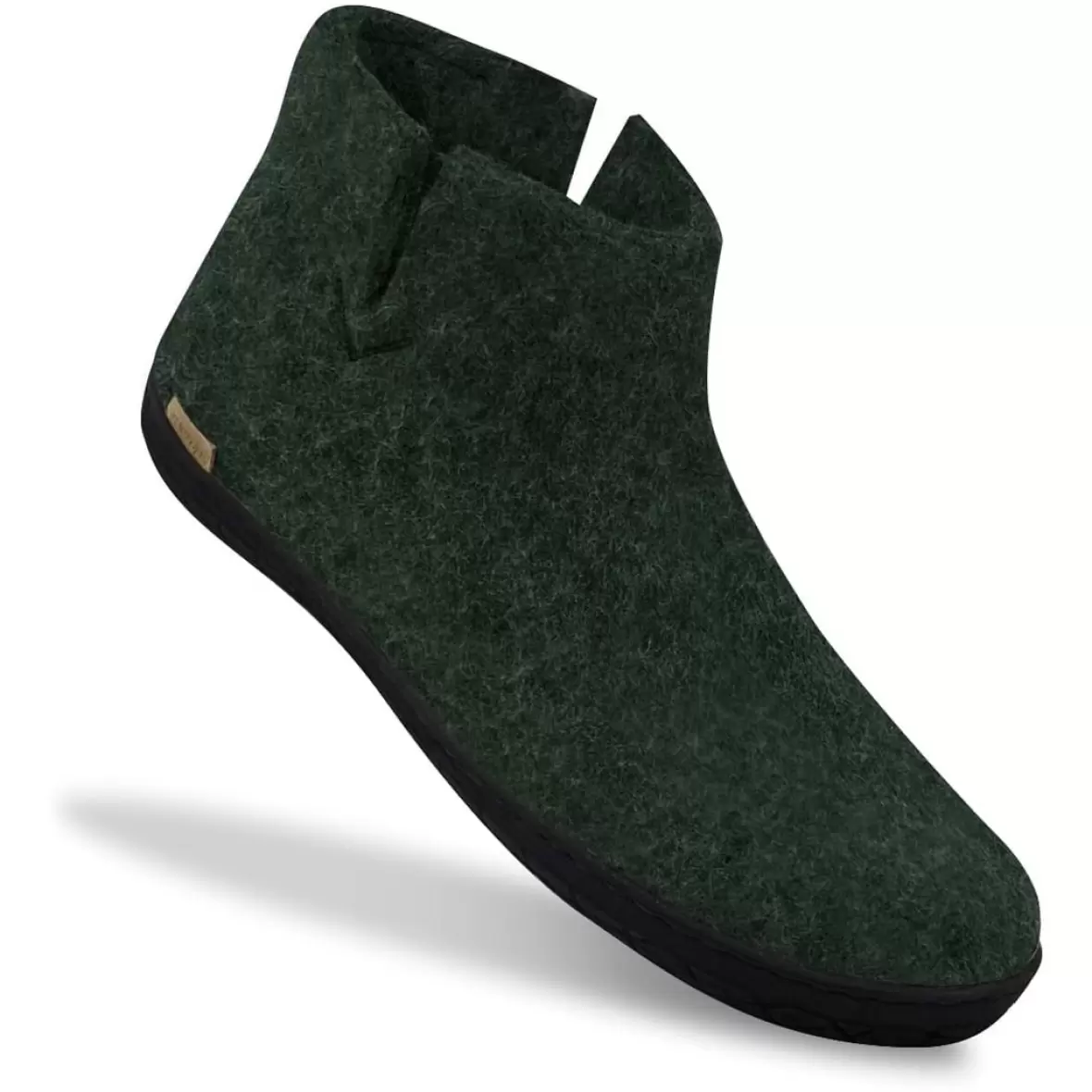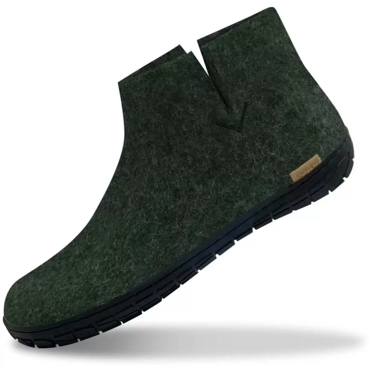 Art. No. GR02-09Glerups GR02-09 Boot with natural rubber er gode hjemmesko til voksne fra mærket Glerups. De er fremstillet i 100 % naturlig, filtet uld, som sikrer varme, åndbarhed og en blød komfort omkring foden. Den fleksible ydersål i naturgummi giver et stabilt og skridsikkert greb, så de kan bruges både indendørs og udendørs. Det høje skaft giver ekstra varme omkring anklen, og den dybgrønne farve tilfører et roligt og naturligt udtryk. Perfekte hjemmesko til afslappede dage med fokus på kvalitet og komfort.