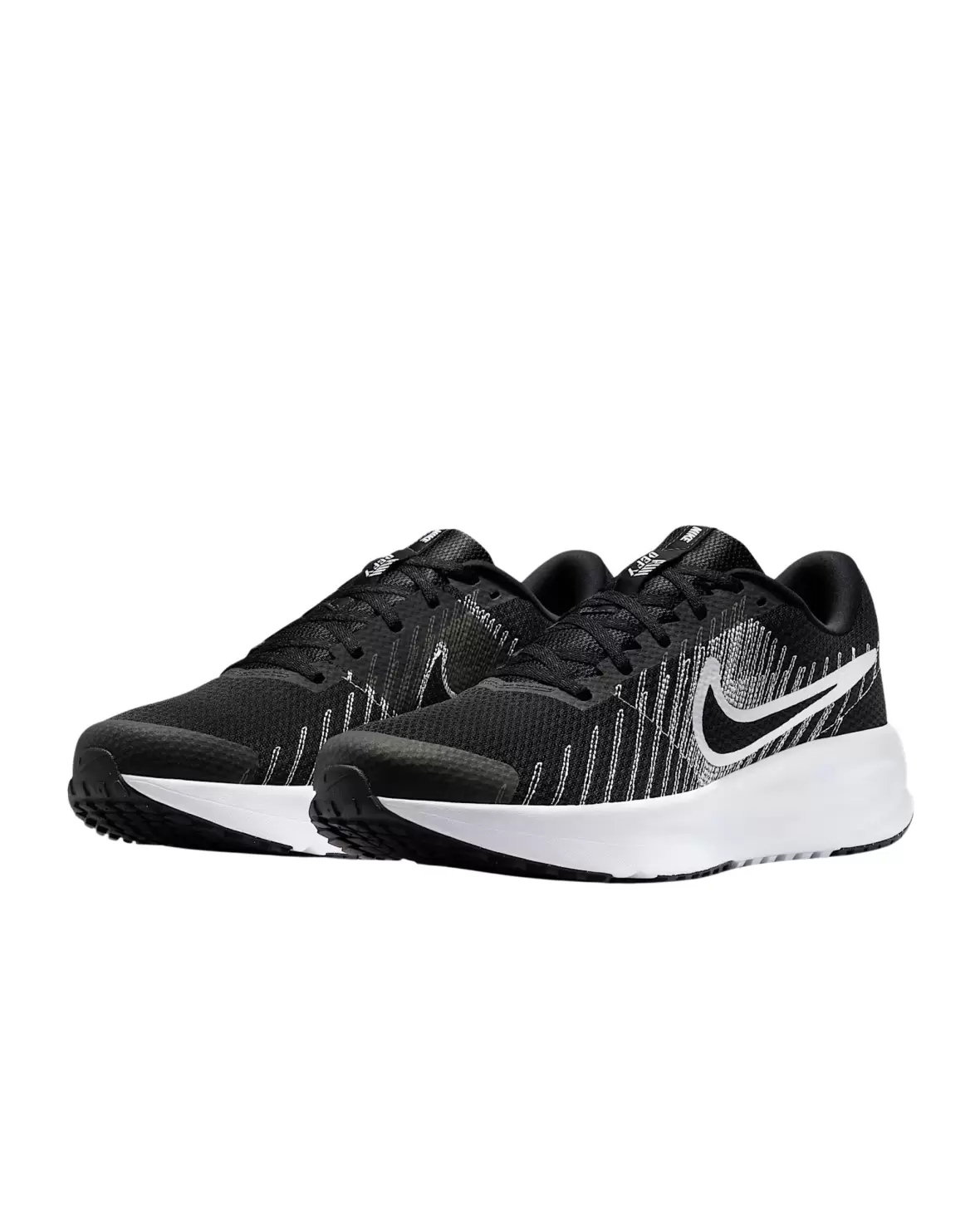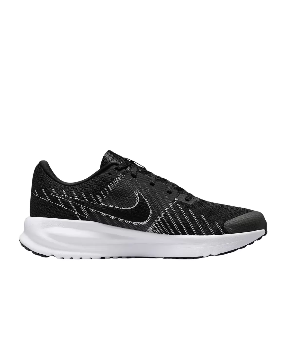 Den lette mellemsål giver fremragende stødabsorbering, mens den robuste ydersål sikrer optimalt greb på forskellige underlag. Det klassiske sorte design med hvide Nike-detaljer giver et stilrent og alsidigt look, der passer både til træning og hverdagsbrug.