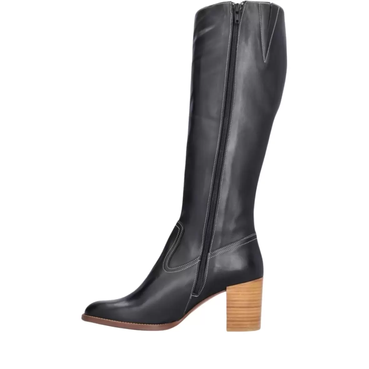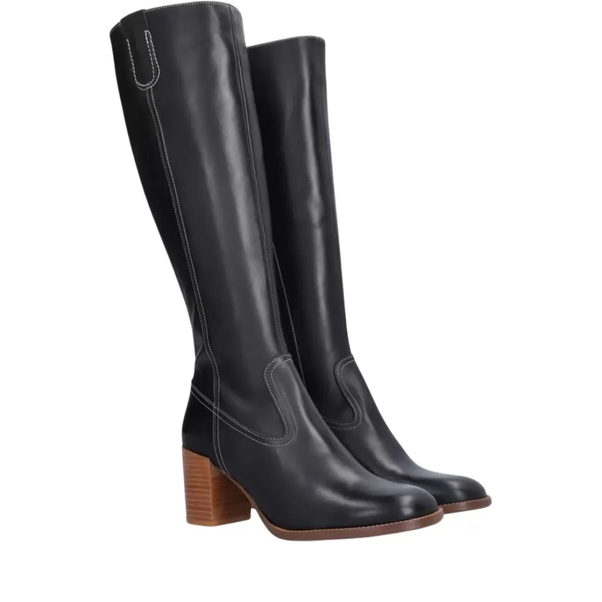 Art. No. A9364-080Disse smukke knæhøje støvler fra Billi Bi kombinerer klassisk design med moderne elegance. Det glatte sorte læder er både stilrent og luksuriøst, mens de lyse kontrastsyninger giver et sofistikeret twist. Støvlerne har en stabil blokhæl i træ-look, som både løfter udtrykket og sikrer god komfort, uanset om du bruger dem til hverdag eller fest.