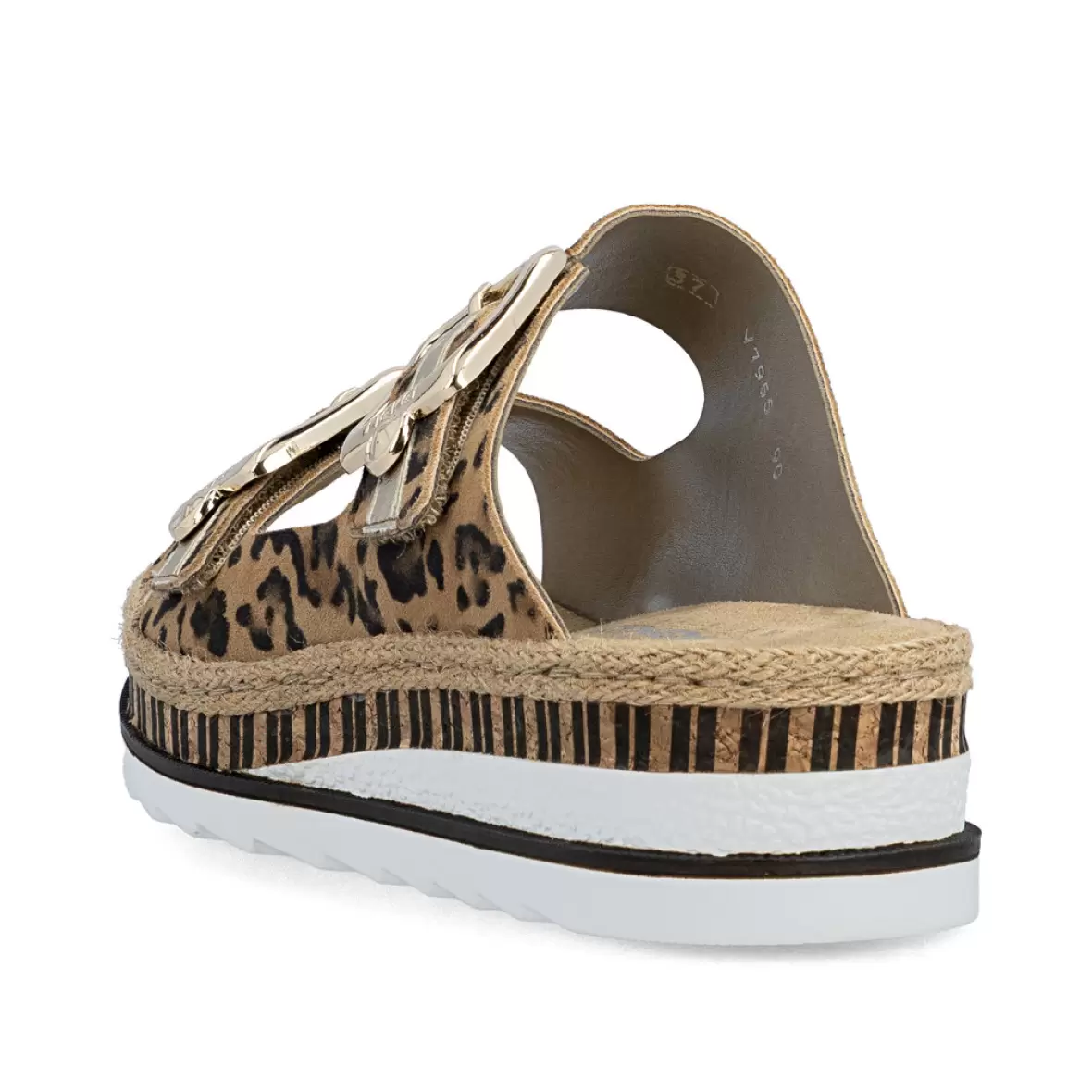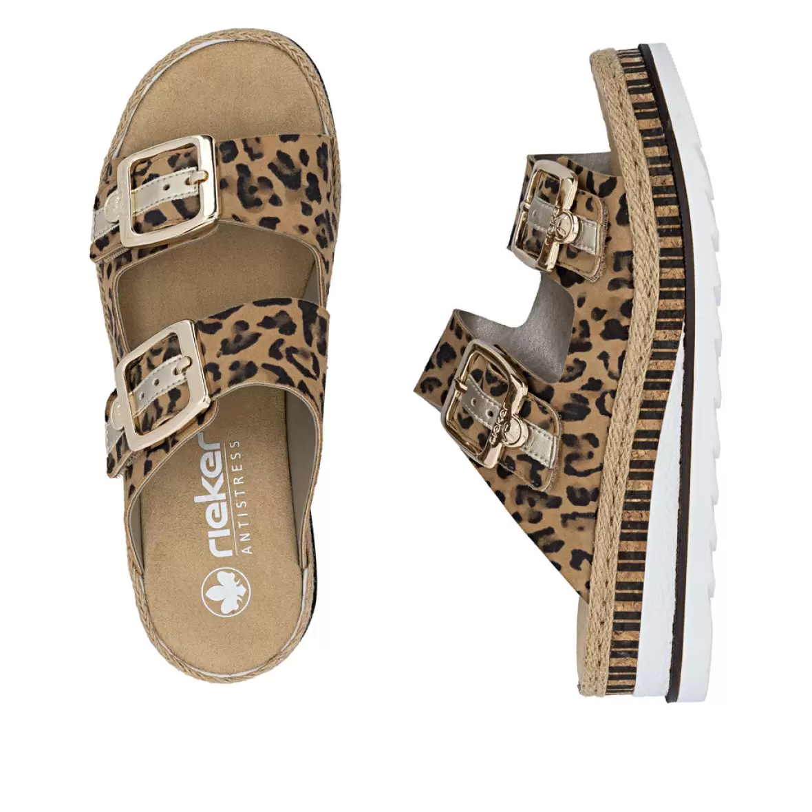 Art. No. V7955-90Rieker V7955-90 er smarte og komfortable damesandaler, der kombinerer et moderne leopardlook med høj komfort. De to justerbare spænder sikrer en god pasform, mens den bløde og formede fodseng giver behagelig støtte hele dagen. Den lette og fleksible sål bidrager til god gangkomfort, og den stilfulde plateaubund giver et trendy udtryk. En perfekt sandal til både hverdag og sommerens mange anledninger.