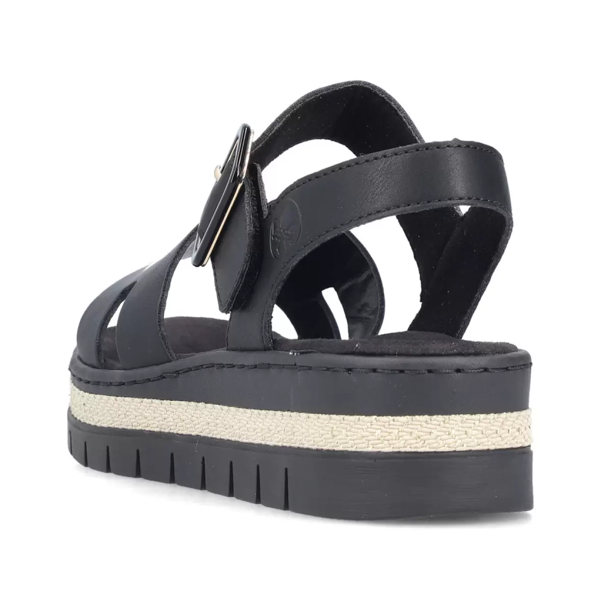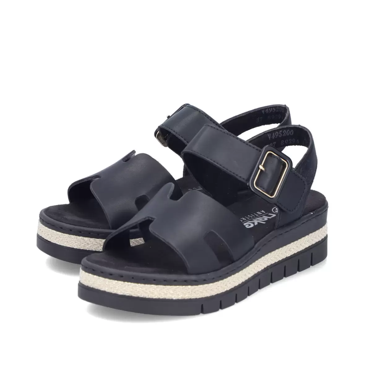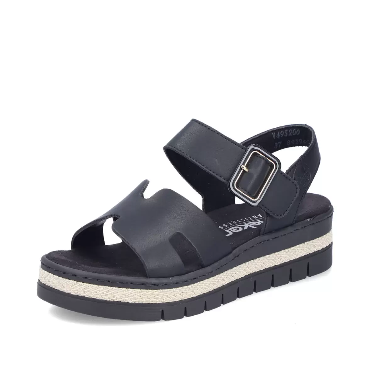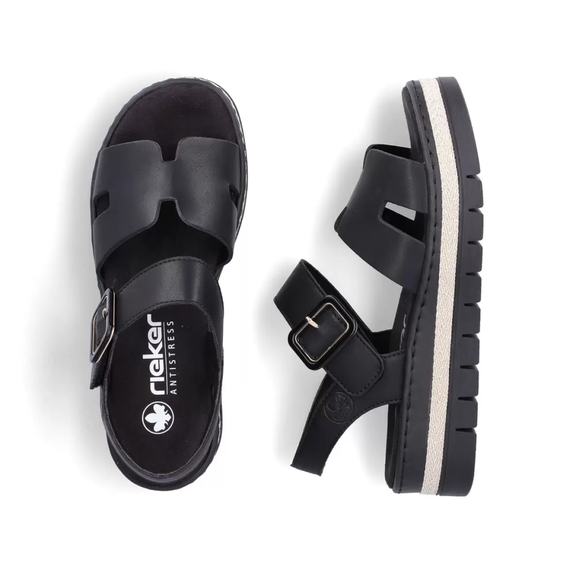 Art. No. V4952-00Rieker V4952-00 er stilrene og moderne damesandaler, der kombinerer et elegant udtryk med den velkendte Rieker-komfort. Sandalerne er udført i sort, blødt materiale med brede remme, som giver et flot og tidløst look, der passer perfekt til både hverdag og sommerens mere pæne anledninger. Den justerbare rem med spænde sikrer en optimal pasform, mens den lette og fleksible sål giver behagelig støtte hele dagen. Den diskrete plateau-effekt tilfører ekstra komfort og et moderne touch uden at gå på kompromis med stabiliteten. Med Riekers antistress-teknologi får du en sandal, der reducerer belastningen på fødderne og gør dem ideelle til lange dage på farten. Et sikkert valg til dig, der ønsker komfort, kvalitet og et stilrent design i én og samme sandal.