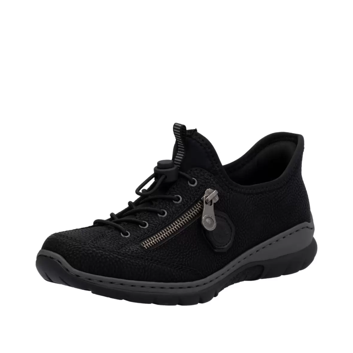 Art. No. L32F1-00Rieker L32F1-00 er et par moderne og praktiske damesko, der kombinerer en sporty stil med maksimal komfort. Skoene er fremstillet i blødt, sort materiale med en let nubret struktur, som giver et stilrent og eksklusivt udtryk. Det smarte elastiske snøresystem gør det nemt at få skoene hurtigt af og på, samtidig med at lynlåsen i siden tilføjer både funktionalitet og et cool detaljepræg.