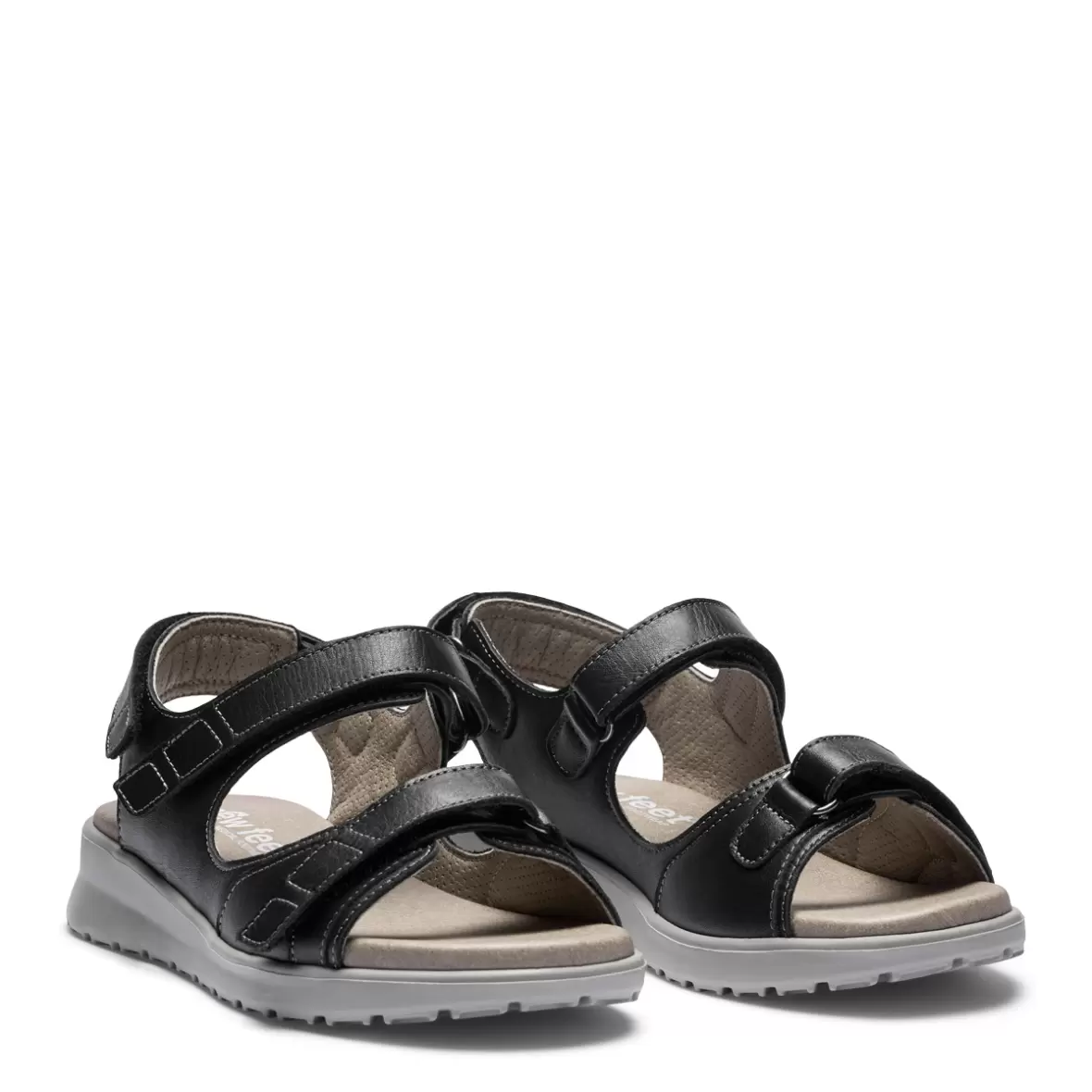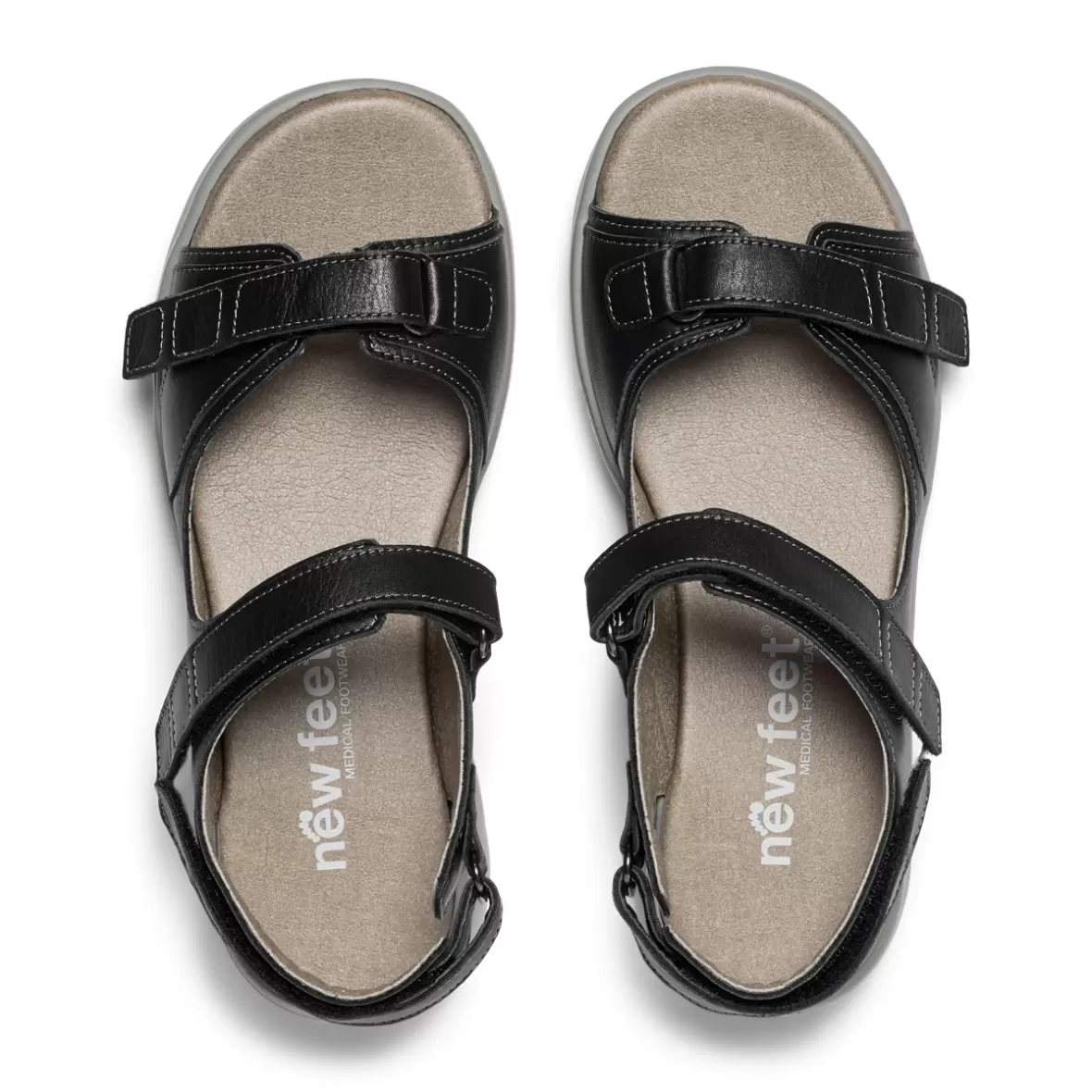 Art. No. 261-18-110New Feet 261-18-110 er en komfortabel og støttende damesandal, udviklet med særligt fokus på følsomme fødder og behov, der kan opstå ved eksempelvis diabetes eller gigt. Sandalen kombinerer et klassisk og tidløst design i sort nubuck med gennemtænkte funktioner, der sikrer maksimal velvære gennem hele dagen.