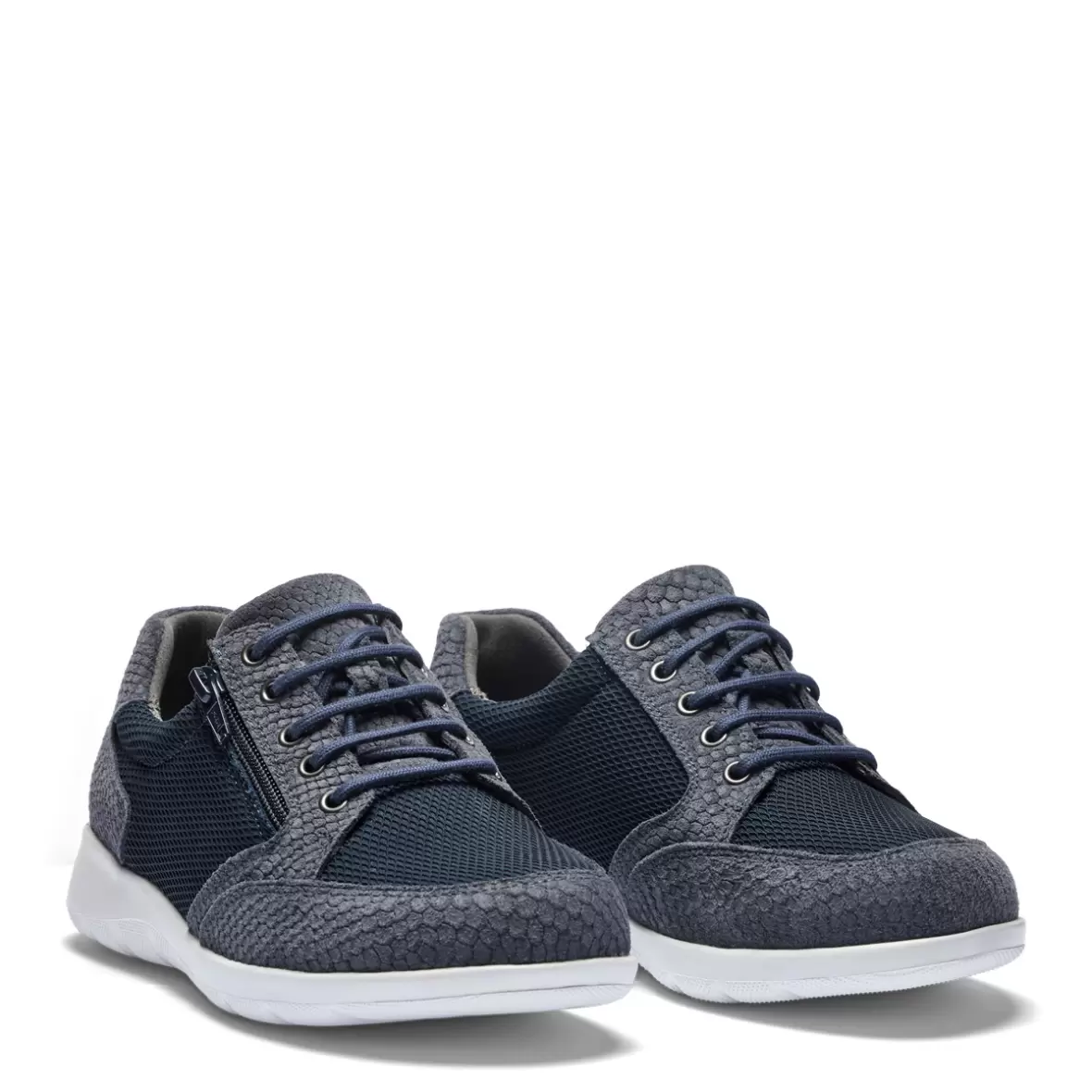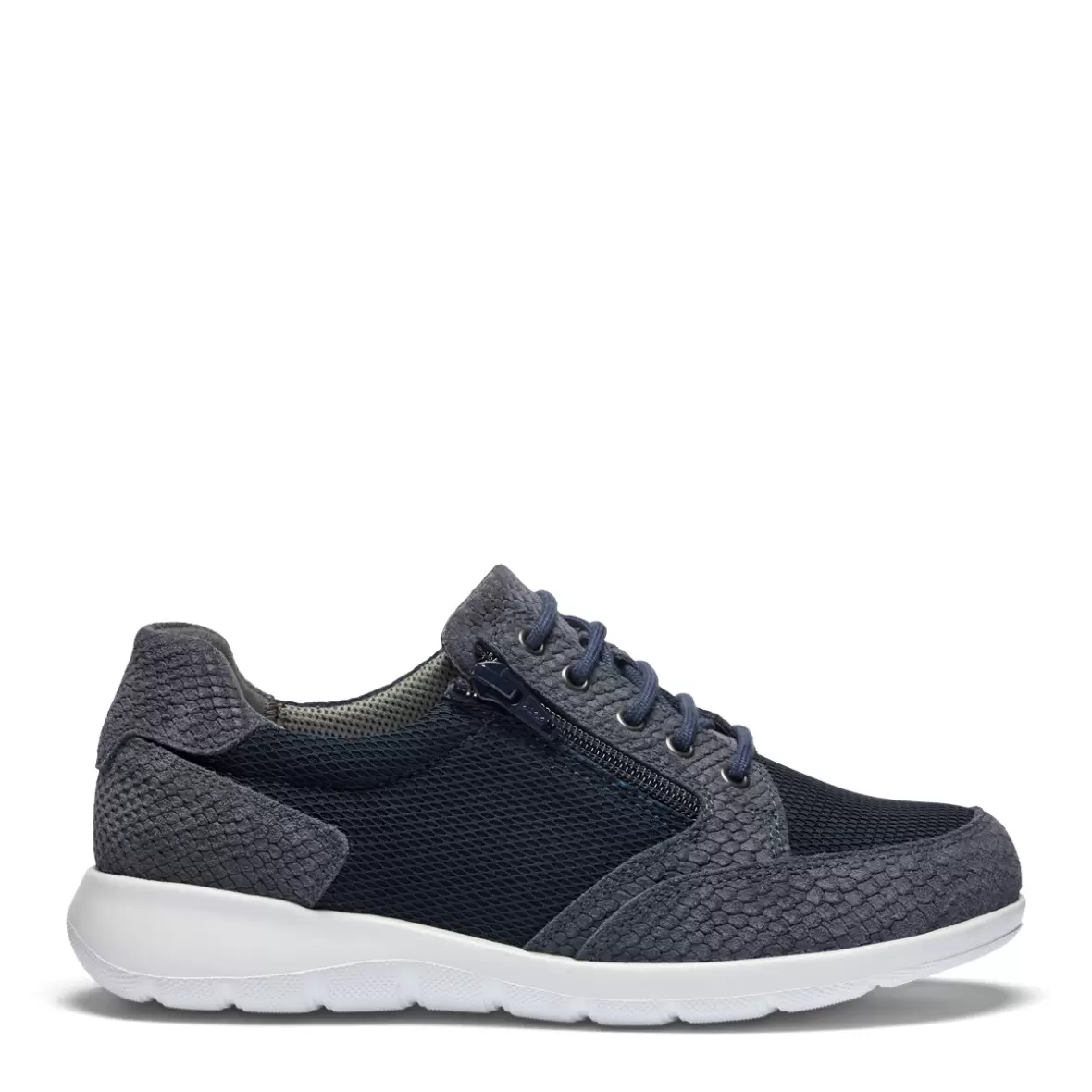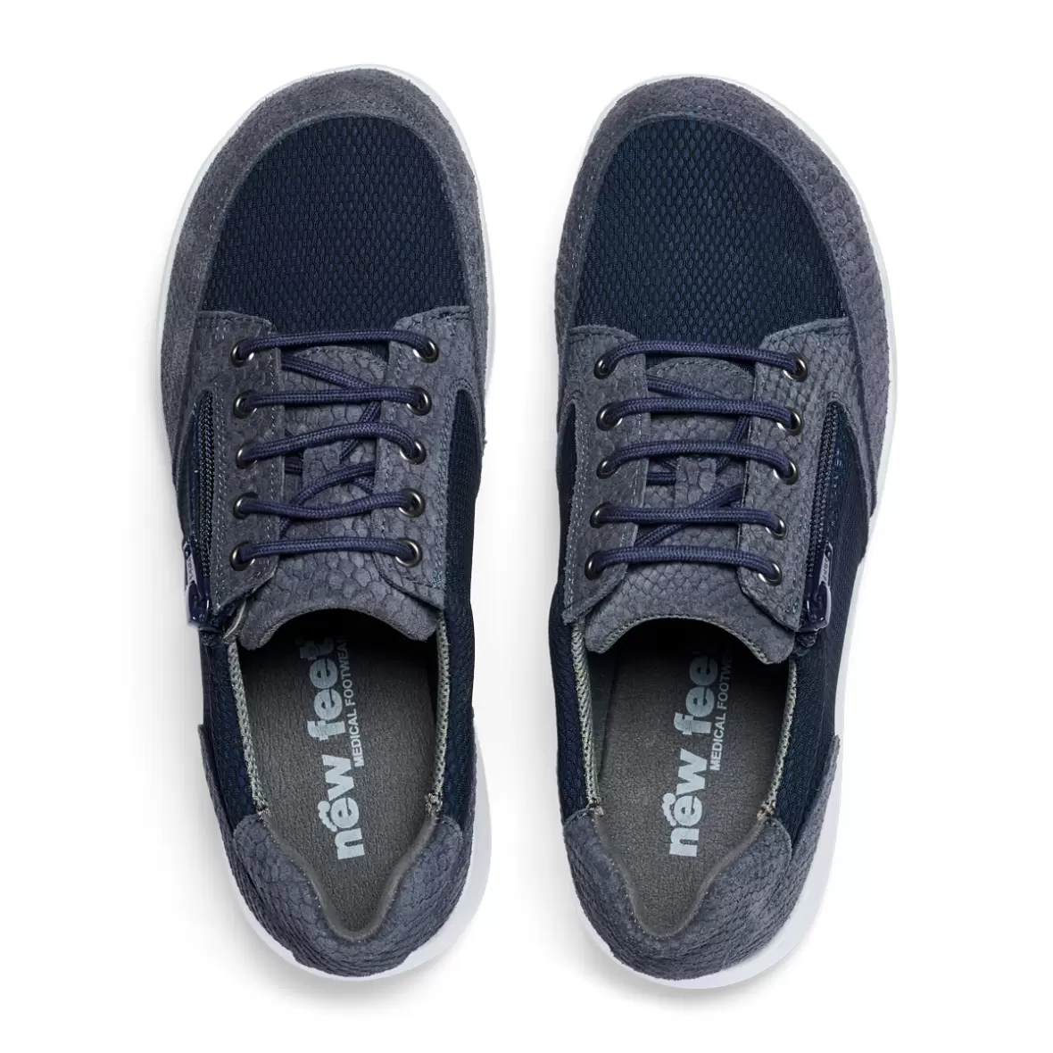 Art. No. 261-44-842Denne sporty damesko fra New Feet kombinerer funktionalitet, komfort og et let udtryk, der gør den ideel til både hverdagsbrug og længere gåture. Skoen er udstyret med både snørebånd og lynlås, hvilket gør den nem at tage af og på, samtidig med at pasformen let kan justeres efter foden. Overdelen er lavet i en kombination af struktureret ruskind og åndbart tekstil, som sikrer god ventilation og en behagelig fornemmelse hele dagen.