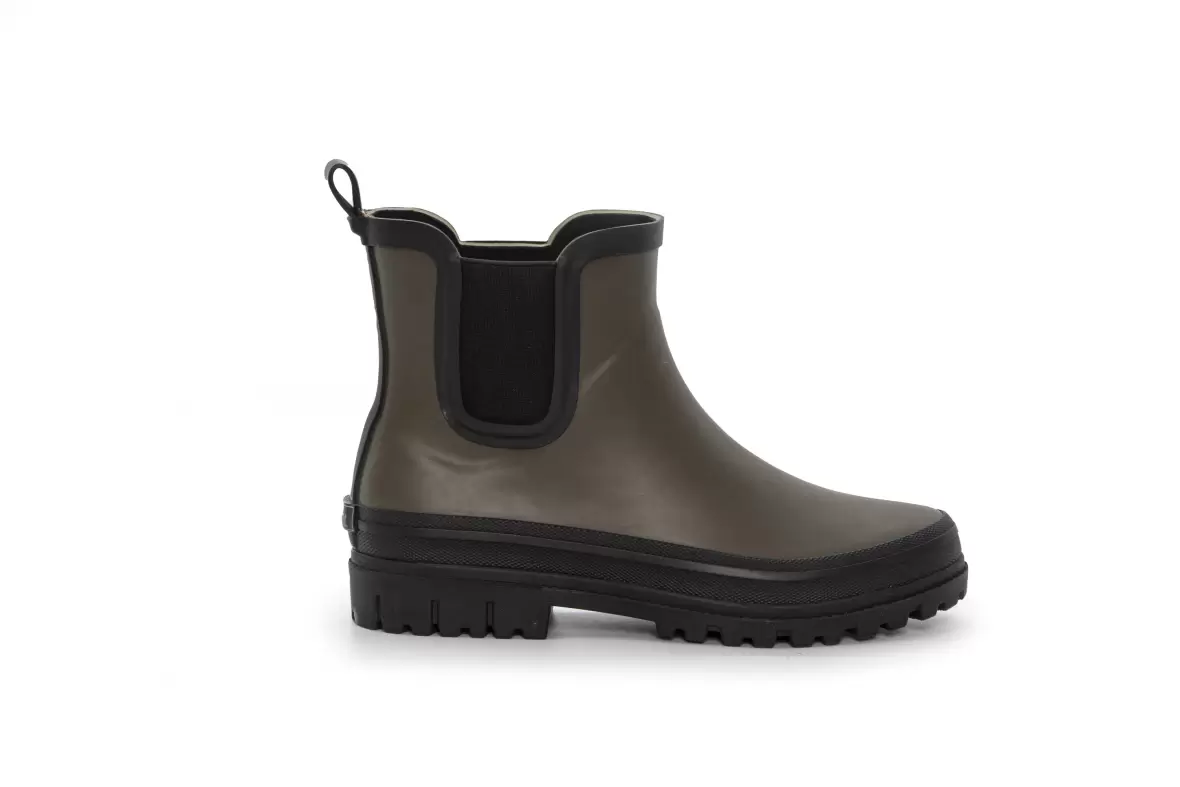 Støvlen er fremstillet i vandtæt gummi, som effektivt holder dine fødder tørre, selv når vejret viser sig fra sin våde side. De elastiske sidepaneler gør det let at få støvlerne af og på, samtidig med at de sikrer en fleksibel og behagelig pasform omkring anklen.
