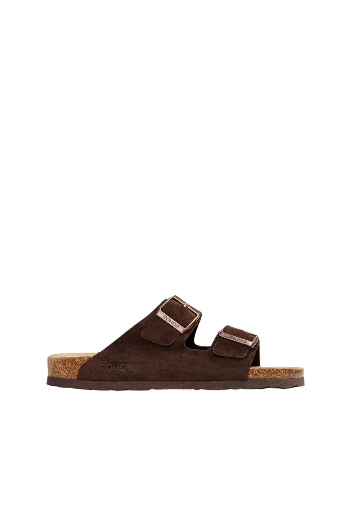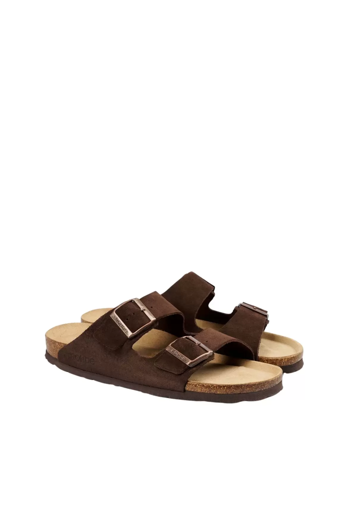 Sandalen er fremstillet i blødt ruskind, som giver et naturligt og eksklusivt look. De to brede remme over foden er udstyret med justerbare spænder, så du nemt kan tilpasse pasformen og sikre, at sandalen sidder stabilt og behageligt.