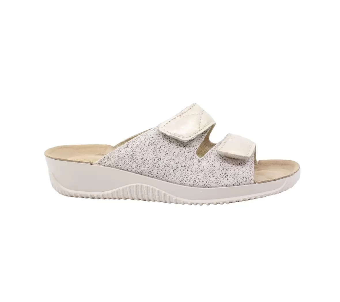 Sandalen er udstyret med to brede velcroremme over foden, der gør det let at justere pasformen efter behov. Det giver en stabil og behagelig pasform, samtidig med at sandalen er nem at tage af og på. Overdelen har en blød og let struktureret overflade, som bidrager til et elegant og afslappet look.