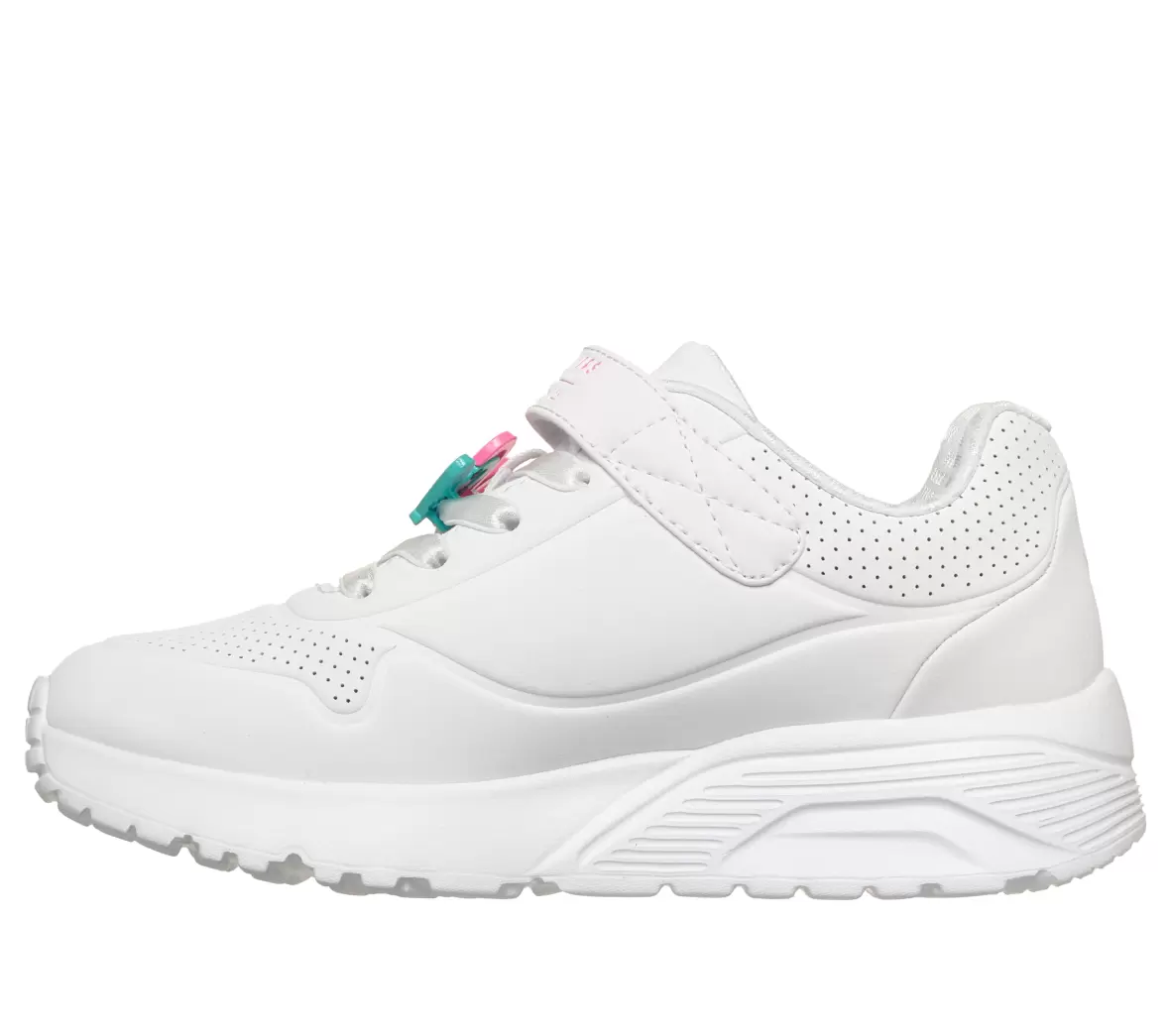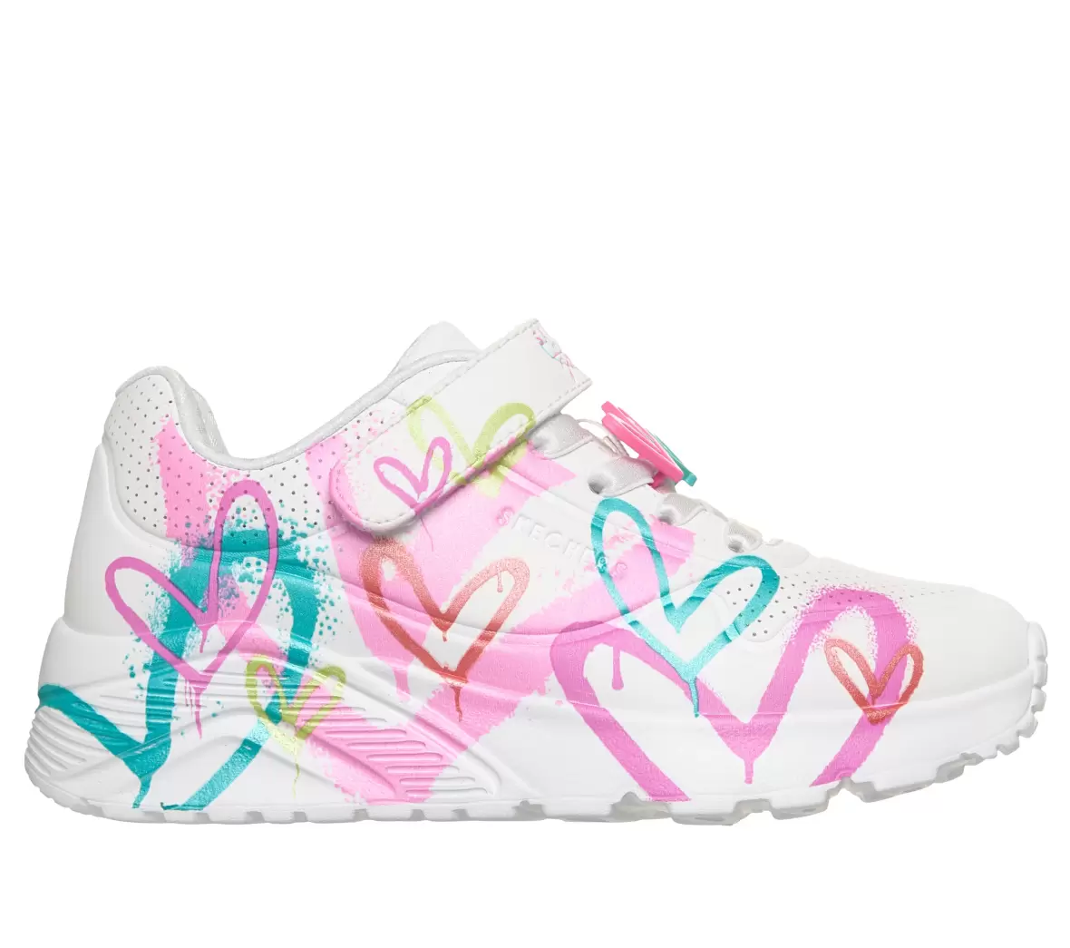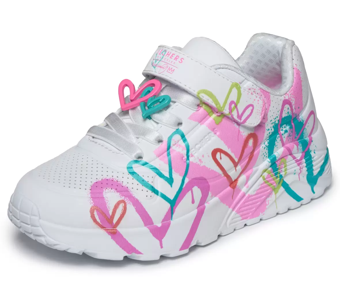 Art. No. 314966L WMLTSkechers Goldcrown Uno Lite Heart 314966L WMLT er en smart og iøjnefaldende børnesko, der kombinerer komfort med et legende design. Den hvide overdel er dekoreret med farverige hjertemotiver, som giver skoen et kreativt og moderne udtryk, perfekt til børn der elsker sko med personlighed.