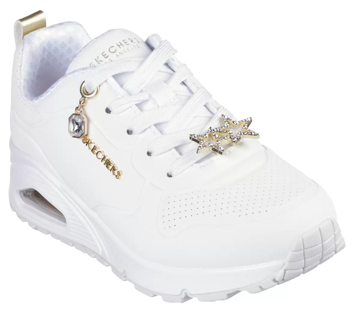 Art. No. 310562L WGDSkechers UNO Gen1 Trendy Jewels er smarte og moderne sneakers til børn, der kombinerer et stilrent design med fine, dekorative detaljer. Skoen er udført i en flot hvid farve, som giver et friskt og alsidigt udtryk, mens de elegante smykkedetaljer tilfører et trendy og legende touch, der gør skoen ekstra iøjnefaldende.