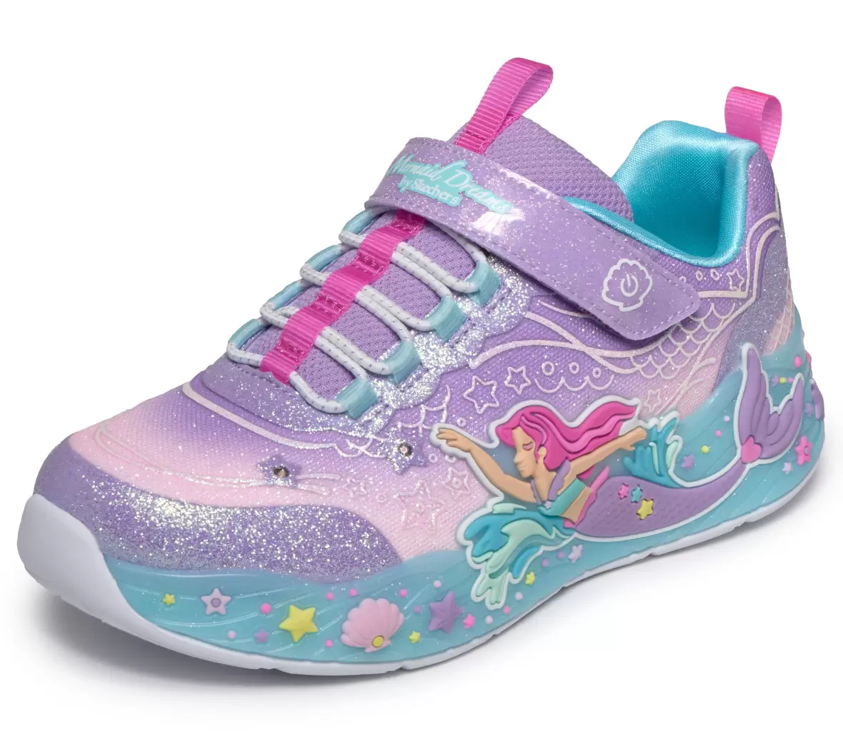 Art. No. 303060L LVMTSkechers S-Lights Mermaid Dreams 303060L LVMT er farverige og fantasifulde børnesko, der kombinerer komfort med masser af sjov. Skoen er designet i glitrende lilla og rosa nuancer med havfrue-tema og fine detaljer som stjerner, muslinger og bølger, der giver et eventyrligt udtryk. I sålen sidder indbyggede LED-lys, som lyser op ved hvert skridt og gør skoene ekstra spændende at have på.