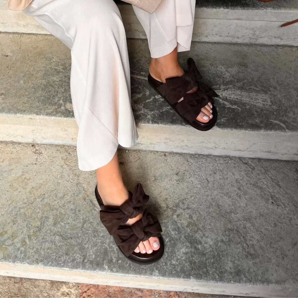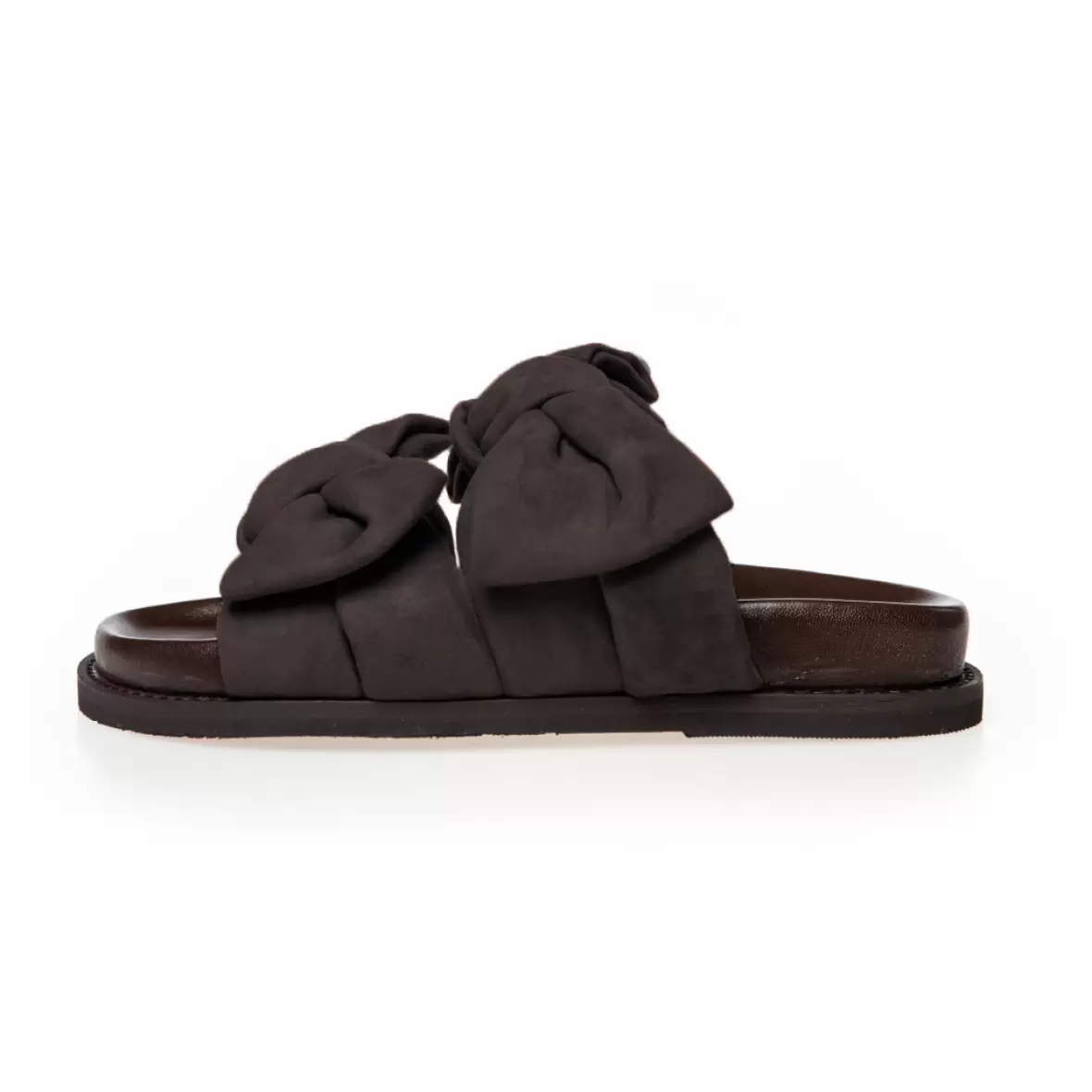 De brede remme over foden er smukt dekoreret med store sløjfer, der tilfører et moderne og iøjnefaldende udtryk. Den åbne slip-on model gør sandalen nem at tage af og på, samtidig med at den giver et let og luftigt feel – perfekt til varme dage.