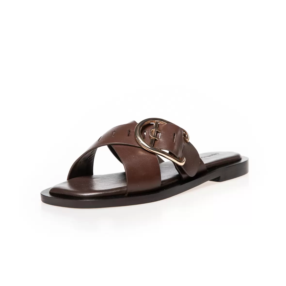 De brede, krydsede remme over foden giver et enkelt og tidløst design, mens det dekorative guldfarvede spænde tilfører et feminint og eksklusivt touch. Spændedetaljen skaber en flot kontrast til det mørke skind og understreger sandalens elegante stil.