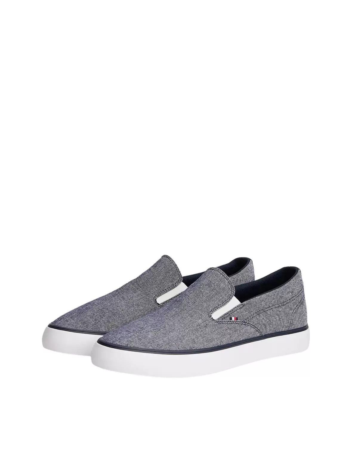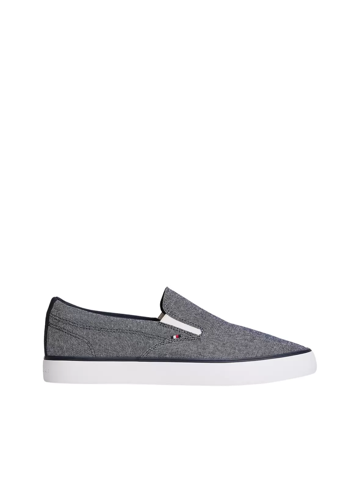 Overdelen er udført i et let chambray-inspireret tekstilmateriale, som giver skoen et afslappet og sommerligt udtryk. De elastiske paneler i siderne sikrer en fleksibel og behagelig pasform, så skoen sidder godt om foden uden behov for snørebånd. Den diskrete Tommy Hilfiger-signatur ved siden understreger det eksklusive og genkendelige brandudtryk.