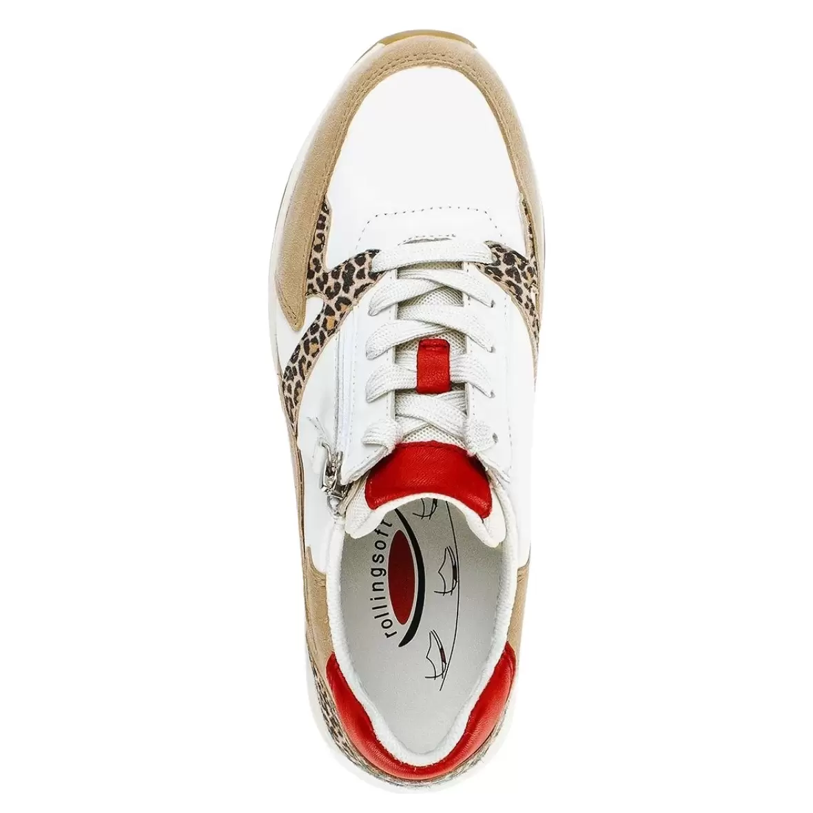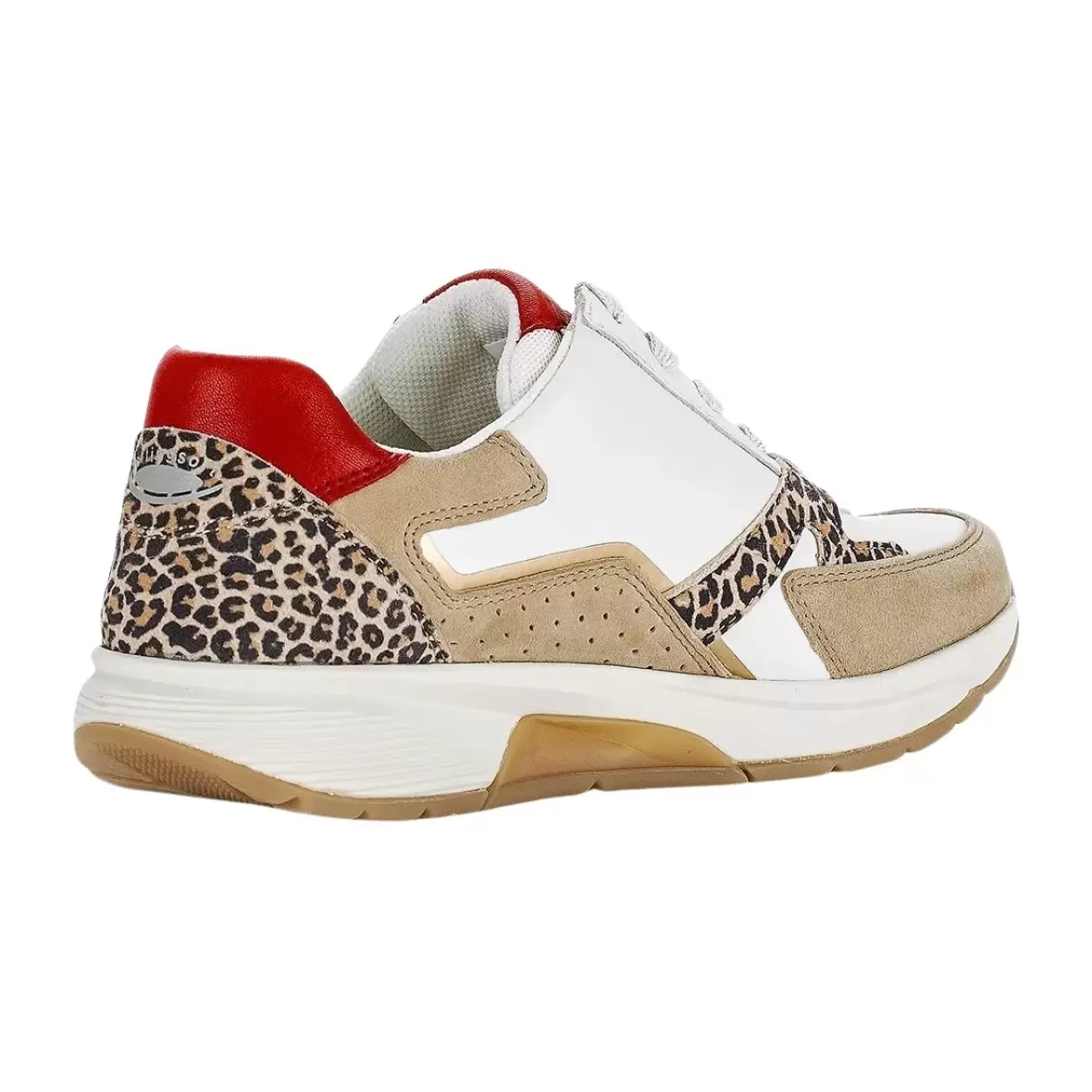 Art. No. 86.878.68Gabor 86.878.68 er en smart og moderne sneaker til damer, der kombinerer sporty komfort med feminine detaljer. Modellen skiller sig ud med sin spændende kombination af materialer og farver, hvor klassisk hvid suppleres af beige nuancer, røde kontraster og et iøjnefaldende leopardmønster, som giver skoen et trendy og eksklusivt udtryk.