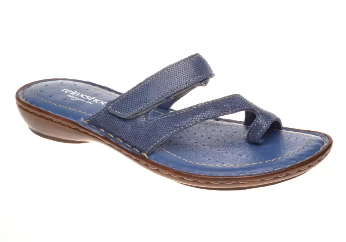 Art. Nr. 9725 Slipper i blåt præget skind fra Relaxshoe med tåsplit. Sandalen kan reguleres med en velcrorem. Super dejlig komfort og støddæmpende sål.