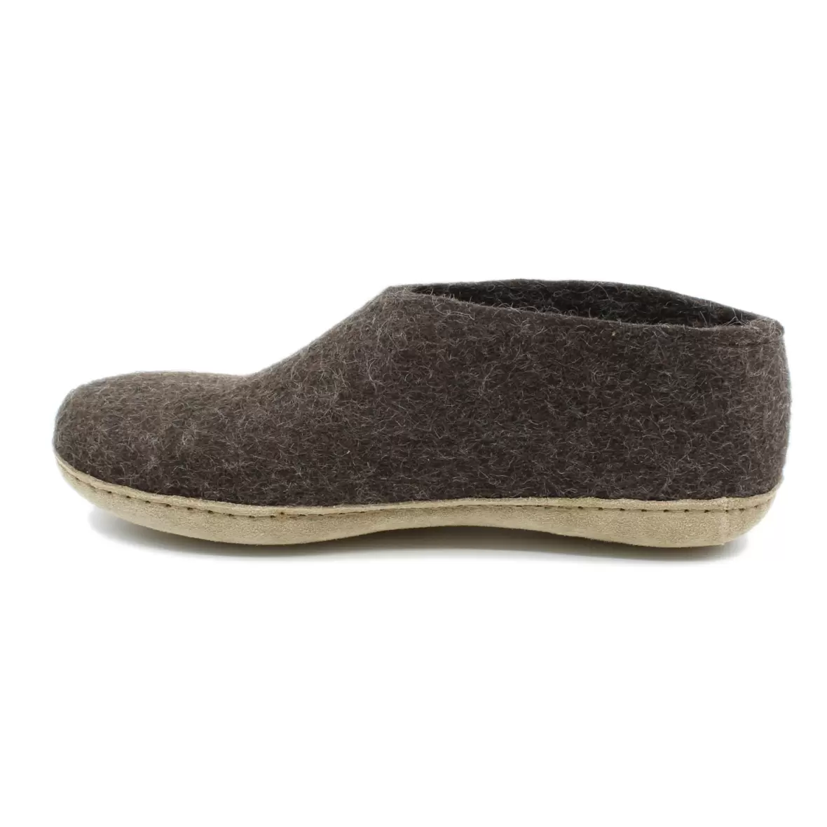 Art. nr. A-04-00Filt hjemmesko fra Glerups i brun med hælkappe, hjemmeskoen er lavet i 100% naturligt uld og har en sål der er lavet i kalveskind. En hyggelig hjemmesko der holder fødderne lune på selv de koldeste dage.