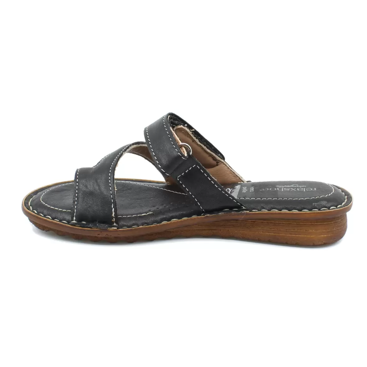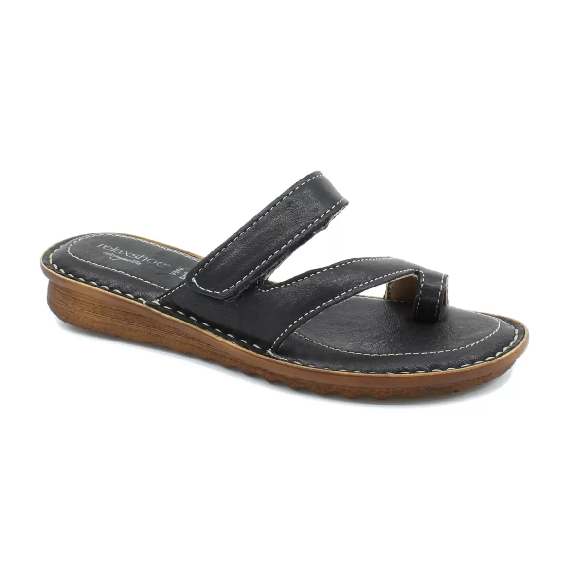 Art. nr. 319-020Slippers fra Relaxshoe lavet i sort glat skind. Sandalen har Tå-rem og en krydsende rem over vristen, den kan reguleres ind efter foden med velcro på den øverste rem. Den bløde og støddæmpende sandal er lavet på en naturfarvet PU sål. Et must have på de varme sommerdage.