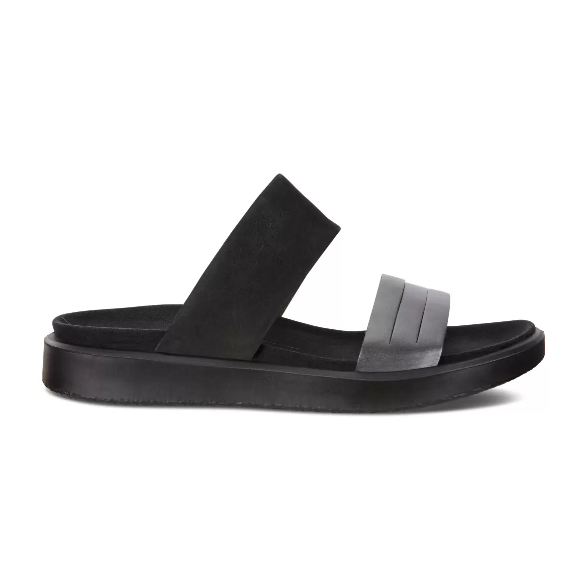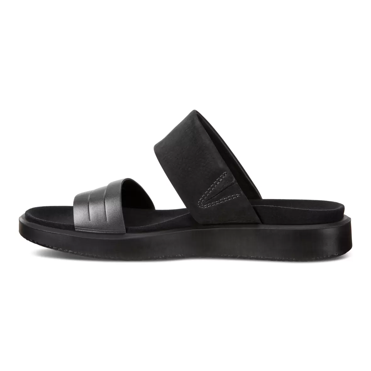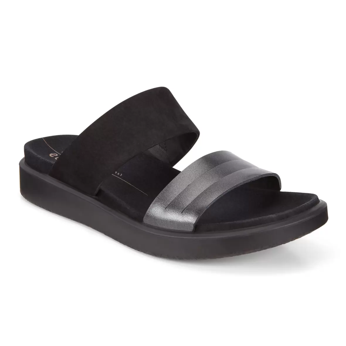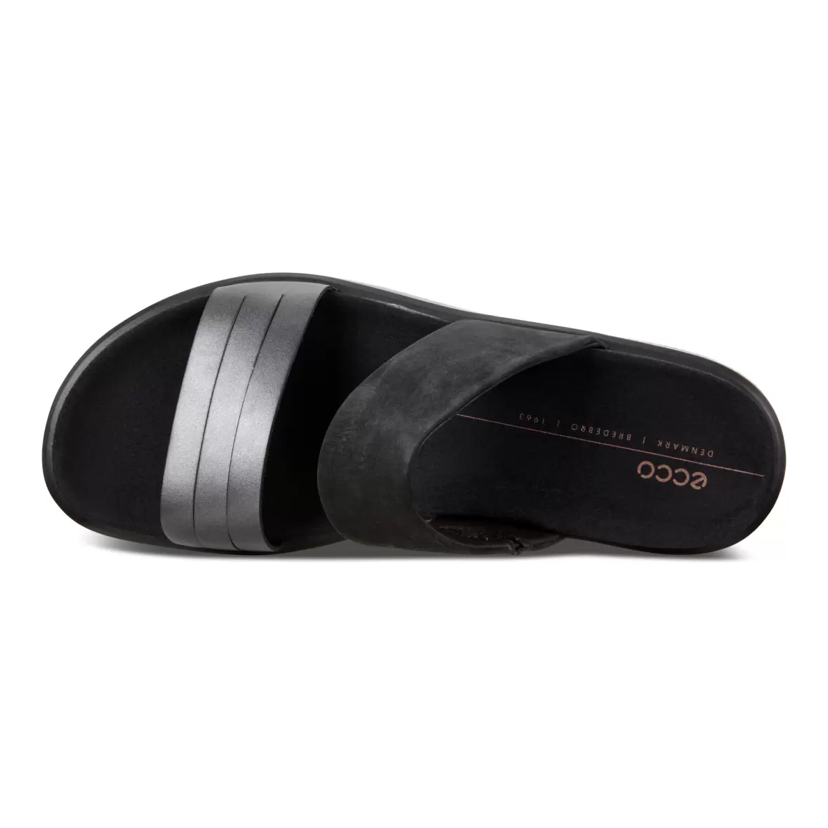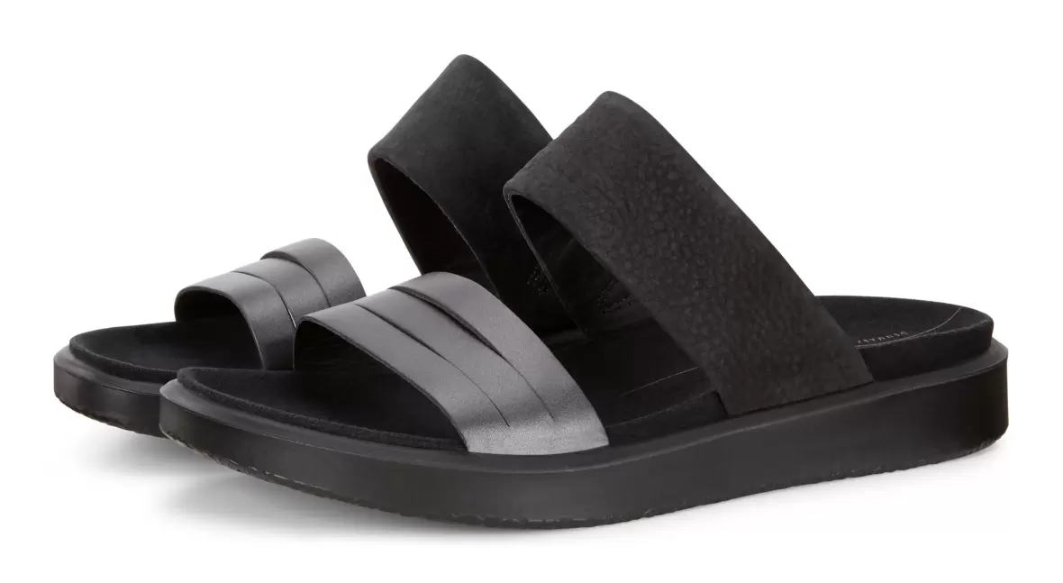 Art. nr. 273623-51385Ecco Flowt slippers sandal i sort skind med bredde remme over forfod samt vrist, remmen ved forfoden har en flot sort metallic overflade, som giver et rigtig smart look til den ellers klassiske slippers. En skøn sandal med en god komfort og lette,fleksible og støddæmpende PU såler.